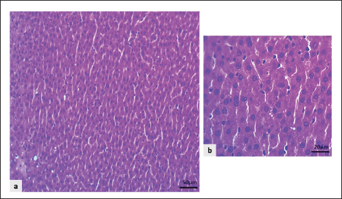 Fig. 6. Light microscopic sections of the liver in the NC group revealed: a and b: The regular hepatocyte arrangement and intact structures of the sinusoidal capillaries (H&E stain). The liver sections from PC group rats showed a higher score and more severe hepatic changes than those from the NC group. They revealed marked swelling of hepatocytes, enlargement of hepatocytes with a centrally located nucleus that leads to narrowing of sinusoidal capillaries with hydropic degeneration of hepatocytes, enlarged, pale vacuole cells with eccentrically located nuclei and marked congestion of the central vein, portal vein, and sinusoidal capillaries, along with noticeable infiltration of neutrophils, particularly surrounding the central vein, periportal area, and even within liver parenchyma (Fig. 7a–f).
