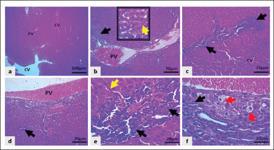 Fig. 7. Light microscopic section of the liver in the PC group showed: a–e: Severe congestion of the central vein (CV), portal vein (PV), and sinusoidal capillaries (inset and yellow arrows), marked infiltration of neutrophils in peri-centrilobular regions and periportal area (black arrows). f: Marked hepatocytic swelling and hydropic degeneration indicated by red arrows (H&E stain).