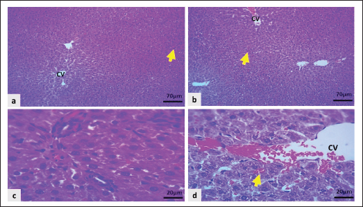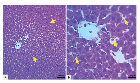 Fig. 8. Light microscopic section of the liver in the CO group showed: a and b: Uncongested central vein (CV) with mild sinusoidal congestion (black arrows), and hepatocytes swollen mildly (H&E stain). Rats in the CO showed mild hepatocyte swelling with a mild degree of congestion in the sinusoid, while the central vein and portal vein remained normal (Fig. 8a and b). The Cyc + HD Dipyr revealed focal congestion of the central vein. At the same time, the portal area remained normal, with mild congestion of sinusoidal capillaries and moderate swelling of hepatocytes. The hepatocytes were swollen and pale, looking like a cloud (Fig. 9a–d).