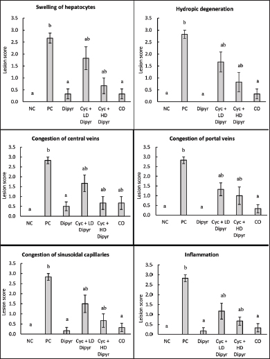 Fig. 12 Grading of lesions across the experimental groups. Scores are shown as columns, while the error bars indicate standard errors of the means. Different letters indicate statistical differences between the groups at p < 0.05, as determined by the Kruskal-Wallis test. DiscussionCyc is an anticancer and immunomodulating agent known for causing hepatotoxicity (Srirangan and Sabina, 2025). This study assessed the protective potential of Dipyr against Cyc-induced hepatotoxicity in rats, with a special focus on changes in body and liver weights, hematological parameters, liver function biomarkers, OS indices, inflammatory mediators, and histopathological alterations. The findings confirmed Cyc’s well-established hepatotoxic and immunosuppressive effects. On the other hand, the results also highlighted Dipyr’s dose-dependent ameliorative effects on OS, inflammation, and hepatic tissue injury. Body weight changes are indicators of the general health status, and fluctuations often indicate chemical-induced systemic toxicity in animal models (Nevzorova et al., 2020). In this study, no significant differences in body weight were observed from day 1 to day 9, when Cyc was not yet administered to the rats. However, the weights of the rats in the PC group were significantly lower than those of the other groups. This decline in body weight highlights Cyc’s toxic and stress-inducing effects, which may have resulted from reduced appetite, nutrient absorption, or tissue metabolism. A significant reduction in body weight following Cyc administration was also reported by other researchers (Zhang et al., 2021). In contrast, Dipyr-treated rats exhibited less pronounced weight loss, suggesting that Dipyr had a protective effect against Cyc-induced systemic toxicity, likely through its antioxidant and cytoprotective properties. The liver-to-body weight ratio serves as a valuable measure of hepatomegaly and hepatic injury (Hussein et al., 2024; El Fatimi et al., 2025). Cyc treatment in our study resulted in a significant increase in liver-to-body weight ratios, consistent with acute hepatotoxicity, as reported by other researchers (Alam et al., 2023). The hepatomegaly in the PC and the other two Cyc-treated groups is probably attributed to hepatocellular degeneration and swelling, and vascular congestion (Ozturk et al., 2023), as confirmed by the histopathological findings. Although Dipyr partially reduced the hepatomegaly induced by Cyc, the ratios remained higher than those in the NC, CO, and Dipyr-only groups. This outcome implies that, although Dipyr mitigates some aspects of hepatic injury, its effect on organ enlargement was limited within the study’s short timeframe. Hematological analysis revealed significant leukocytopenia in Cyc-treated groups, accompanied by profound lymphocyte depletion. This result coincides with the well-documented myelosuppressive effects of Cyc, which poses toxic impacts on proliferating lymphoid cells (Kang et al., 2022; Basu et al., 2025). However, treatment with Dipyr at low and high doses did not reverse the myelosuppressive effect of Cyc. This outcome reinforced the fact that Cyc is an immunosuppressive and myelosuppressive agent, as reported by other studies (Basu et al., 2025), while showing that Dipyr does not protect against Cyc-induced bone marrow suppression. The results confirmed that Dipyr had hepatoprotective effects, without a significant impact on bone marrow tissue. On the other hand, Cyc treatment did not significantly affect erythrocyte counts, hemoglobin, hematocrit, and platelet indices. This is because the rats were sacrificed 2 days after Cyc treatment, a time interval insufficient to cause erythrocytopenia, as erythrocytes have a long lifespan. This outcome was expected given the short duration of the study relative to the erythrocytes’ long lifespan. The liver biochemical markers further supported the hepatotoxic effects of Cyc, as evidenced by elevated serum ALT, AST, and ALP levels. These results are consistent with earlier reports of Cyc’s hepatotoxic effects, as evidenced by elevated levels of liver function biomarkers (Mostafa et al., 2022; Qian et al., 2022; Alam et al., 2023). Dipyr coadministration reduced the levels of these enzymes toward baseline, especially at the higher dosage, showing its hepatoprotective effect. However, serum GGT and albumin concentrations were not altered across groups. These results demonstrated that the Cyc-induced liver injury was acute and had not progressed to protein synthesis impairment and did not alter bile metabolism within the study timeframe. Cyc-induced hepatotoxicity is primarily mediated by OS induction (Turedi, 2023), as evidenced by the current study. GSH and TAC concentrations decreased, and catalase activity was significantly suppressed, while MDA levels increased in the PC. These outcomes confirmed that Cyc alters the cellular redox balance, enhancing lipid peroxidation and depleting endogenous antioxidants. The reduced endogenous antioxidants and increased lipid peroxides ultimately cause membrane damage and cell death (Abdulrahman et al., 2024; Mohammed-Rashid and Dyary, 2025). Dipyr coadministration restored GSH and catalase concentrations, improved TAC, and reduced MDA levels. The antioxidant effect of Dipyr in this study was consistent with previous reports about its antioxidant properties (Alyasiry et al., 2022). The MDA-reducing ability of Dipyr demonstrates its capacity to inhibit lipid peroxidation, a critical factor in Cyc-induced liver toxicity (Cengiz et al., 2022). The activation of NF-κB by Cyc also played a significant role in the pathogenesis of Cyc-induced hepatotoxicity, as the level of the inflammatory marker was significantly higher in the PC group than in the NC group. NF-κB activation reflects an increased inflammatory response induced by OS. In contrast, coadministration of Dipyr with Cyc inhibited NF-κB expression in a dose-dependent manner, restoring its lev