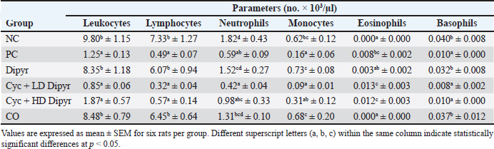 Fig. 2. Body weights on days 1, 9, and 11 of the study, as well as liver-to-body weight ratios across the different experimental groups on day 11 of the study. Data are presented as mean ± SEM (n=6 per group). Error bars labeled with different letters (a, b, c) indicate statistically significant differences at p < 0.05, as determined by one-way ANOVA followed by Duncan’s post hoc test. The liver-to-body weight ratios in the three Cyc-treated groups were significantly higher than those in the NC, Dipyr, and CO groups (Fig. 2). This increase in the liver-to-body weight ratio in the Cyc-treated groups indicates acute hepatotoxicity. However, the liver-to-body weight ratio in the groups treated with Cyc + Dipyr remained significantly higher than in the other NC, Dipyr, and CO groups, suggesting that coadministration of Dipyr with Cyc had only a limited effect on Cyc-induced hepatomegaly. Hematological parametersThe total leukocyte count decreased drastically in the Cyc-treated groups from the baseline of 9.8 × 103 leukocytes/µL in the NC (Table 1). The differential leukocyte count revealed that the leukocytopenia following Cyc treatment was primarily due to a decrease in lymphocyte counts. These findings indicate that Cyc treatment induces marked leukocytopenia, primarily through lymphocyte depletion, whereas Dipyr treatment did not prevent leukocytopenia. Table 1. Total and differential leukocyte profiles across experimental groups.