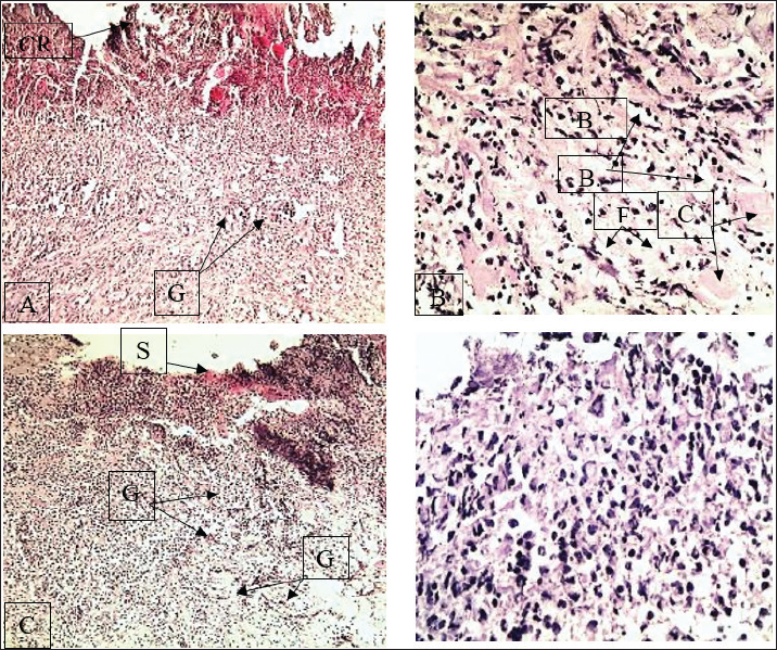 Fig. 1. Histology of the skin in the first week of the study showing the start of the sequence of events in wound repair. In G1 (A-B), the slices show a thick surface crust, granulation tissue (macrophages with collagen fibrosis), and collagen fibrosis, whereas G2 (C-D) shows crust sloughing, an organized pattern of collagen interlaced with dominant collagen and neutrophils, suggesting a more advanced stage of the stream of continuum. G=granulation tissue, B=blood vessel, F=fibrosis/collagen fibers, C=crust, S=epidermal surface, BV=blood vessel, CO=collagen, MQ=macrophages, H=hair follicle, M=muscle. A, C, 100 B, D 400. Second weekBy the second week, the histology of tissue samples from the G1 group showed moderate epidermal hyperplasia, particularly of the stratum basale. The collagen fiber bundles had an increased thickness, and new blood vessels continued to develop. The macrophages were still active in the interstitium. The wound was still not closing at the wound edges. Some signs of the inflammatory response continued. As healing progressed, more tissue regeneration appeared to be necessary for complete healing. On the other hand, the G2 samples displayed more accelerated healing. The wound surface had little remaining scab. The epidermis showed downgrowth, and the wound margins had already fused. The surface was underpinned by a dense collagen matrix, and the macrophages were still present to encourage remodeling. At higher magnification (X400), more compact and aligned collagen fibers were seen. In the second week, tissue samples demonstrated that the Fetal Calf Serum significantly advanced tissue regeneration and epidermal remodeling and enabled more rapid wound closure (Fig. 2).