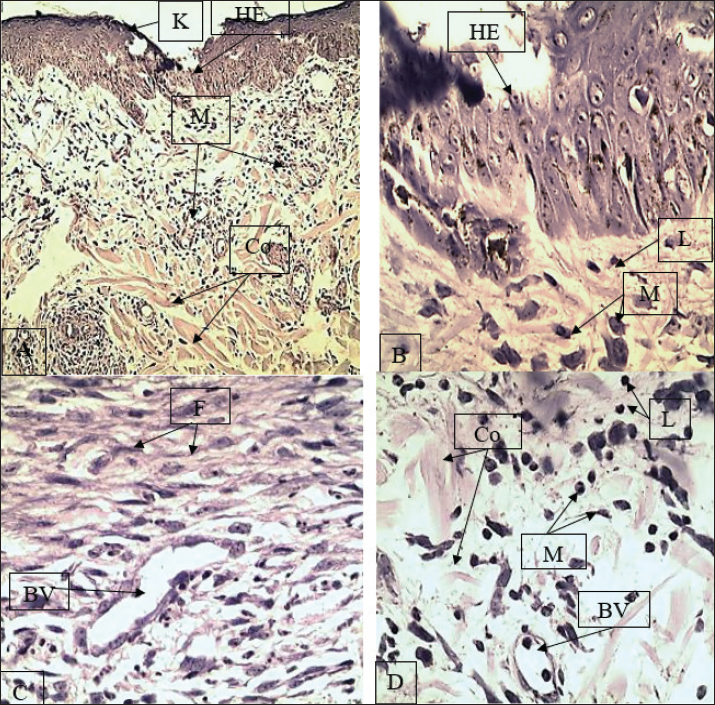 Fig. 2. Skin tissue repair at the second week. G1 (A–B) tissue sections show downward growth of the basal epidermis, collagen deposition, and the presence of new lood vessels (angiogenesis). G2 (C–D) tissue sections show epidermal bridging, slight crusted areas, collagen within the connective tissue, and macrophages in the tissue, which aids healing (remodeling). A=angiogenesis; K=keratin; HE=hyperplastic epidermis; M=macrophages; Co=collagen fibers; H=hair follicle; BV=blood vessel; L=lymphocytes; GA=granulation area. Magnification: A and C=X100; B and D=X400. Third weekIn the third week of the study, the G1 group showed a further improvement, although still lagging. Prominent horizontal crests of fibrosis were observed along the wound surface, along with the development of neovascularization. However, the collagen retrogression was still fragile and poor. Although lymphocytes and macrophages were still present, the tissue had not yet reached full structural maturity, suggesting ongoing inflammation. The G2 group underwent surface and microscopic examination, which showed complete wound healing. The epidermis’s basal layer was fully restored, and a newly formed thick keratinized stratum had formed. The dermis, the underlying layer of the skin, had collagen bundles with good structure and organization, interspersed with progressive fibrosis and a plentiful supply of new capillaries. Inflammatory cells were present, but in minor quantities, as they assisted in the remodeling step. Thus, the combination of cellulose and fibrin enhanced healing and tissue quality by the third week (Fig. 3).