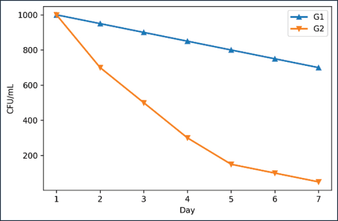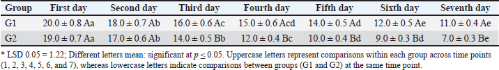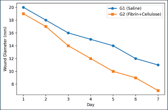 Fig. 7. Bacterial load (CFU/ml) over 7 days in both groups. G2 showed a rapid decrease in bacterial counts. By day 7, G2 was nearly bacteria-free. Duration until complete closureThroughout the study period, both groups experienced no adverse incidents. Mild crusting and erythema, which occurred during the first few days, resolved on their own. None of the participants showed signs of wound infection, excessive discharge, dehiscence, necrosis, or other abnormalities. All dogs exhibited normal eating and behavioral patterns during the study period. DiscussionThis paper proved that using a cellulose-containing fibrin sealant in the treatment of wound healing in dogs is effective, as cellulosic materials, including fibrin, bacterial, and plant cellulosic materials, are significant and recent additions in the field of wound healing. Cellulosic biopolymers, because of their high-water retention, mechanical properties, and biocompatibility, are ideal in wound healing (Portela et al., 2019). In the histological study performed in the third week, epithelial encroachment was advanced, and the collagen in the tissue was more densely organized. Moreover, tissue neovascularization was more abundant in the dogs treated with fibrin–cellulose and the control dogs. Our fibrin cellulose mixture probably did the same as Datta et al. (2025) and provided a neovascularization and cell regeneration scaffolding that fibroblasts require to remodel and proliferate tissues. The observations and results of the study agree with and expand on the works of Paleczny et al. (2021) on biofunctional celluloses. In our study, the palm frond cellulose provided a nanofibrillar scaffold that was instrumental in wound hemostasis and stabilized the wound bed during the early stages of healing, similar to the findings of Cidreira et al. (2021), who showed that the cellulose nanocrystals rapidly promoted hemostasis and reinforced early wound bed architecture. Integrating cellulose with fibrin resulted in a sealant with multiple benefits: structural support for the sealant itself, extended local retention, diminished fluid loss, and inflammation control, all of which are paramount for wound closure. Moreover, the enhanced epithelial regeneration in G2 animals corroborates recently proposed approaches that employ bio-adhesive polysaccharide hydrogels to replicate the dermal layer, thus directing and enhancing cell migration (Yang and Wang, 2023). In comparison to the control group, the treated animals exhibited significantly greater reepithelialization and keratin layer formation. This was likely due to the combined effect of fibrin and cellulose as a matrix and growth stimulant. 3D biofabricated cellulose hydrogels have also been shown to accelerate healing by promoting hydration and stabilizing important growth factors (Tabatabaei Hosseini et al., 2024). Although our technique was simpler and computerized molding was not employed in our design, the end biological effect was still effective. This suggests the broad versatility of cellulose in scaffold-based healing and tissue engineering. Bacterial cellulose materials have preferential use in infected and chronic wounds for their antibacterial and anti-inflammatory properties (Zheng et al., 2020; Meng et al., 2023). Our study demonstrates that the presence of natural cellulose in surgically clean wounds provides an opportunity for a flexible environment that allows for unprecedented tissue remodeling without excessive inflammation. This agrees with Carvalho et al. (2019), who stated that BC is not only a drug carrier but also a passive catalyzer of the healing process. On the third week of the study, samples in the G2 group demonstrated the inactivity of primary polymorphonuclear cells, the presence of intensely streaked collagen aligned in the same direction, and complete restoration of skin and tissue in the deep dermis—these observations prolong the passive role of healing. Future work, as stated by Torkaman et al. (2021), is expected to combine amino-acid-modified chitosan with cellulose to offer more opportunities to augment the healing process of the tissue, and similarly, the work of D A Ghazi et al. (2024) to clinical practices will be offered to patients of 3D prepared BC dressings. This provides an opportunity to offer our patients a more stable healing environment. Moreover, with the results we obtained, it is possible to conclude that a simple fibrin–cellulose mixture is a combination that offers a lot of healing opportunities, and that multifunctional and designed fabrics will be able to offer their healing opportunities in chronic infected extensive wounds. This study has at least 1 limitation. A comparison group where only fibrin was used was lacking. Because this study only compares the fibrin–cellulose sealant to saline, one cannot disentangle the effects of the fibrin itself from the effects of cellulose. Given the material constraints and the primary aim of this preliminary study to assess the performance of the composite formulation, a fibrin-only arm was omitted. Future studies should consider a three-arm design of saline control, fibrin alone, and combined cellulose and fibrin to adequately understand the specific contributions of each constituent to the healing response. Another limitation is that the experiment was performed in healthy animals with clean, organized wounds. The challenge for the sealant was to evaluate its effectiveness on chronic or infected wounds. Clinical challenges remain to be determined, and infected or chronic wounds and healthy wounds will be used to evaluate the clinical effect of the sealant. ConclusionCompared with saline treatment, the sealant made from palm fronds, fibrin, and cellulose showed more rapid wound contraction and more organized granulation tissue in clean surgical wounds. Of all the studies conducted to date, this study was the most convincingly conducted under controlled conditions, providing evidence to s