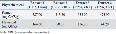Ethical approvalAll research procedures involving animals were conducted in accordance with the ethical guidelines and regulations of The Ethics Committee of Universitas Perintis Indonesia (No. 1318/KEPK.F1/ETIK/2023). ResultsQuantitative analysis of phenols and flavonoids in Cinnamononi extractsTable 2 presents the quantitative analysis of phenol and flavonoid contents in the four types of cinnamon extracts. Extract 1 contained higher levels of phenols and flavonoids than Extract 2, although both were derived from the same raw material ratio (1:2:2; cinnamon:noni leaf:noni fruit). The difference was attributed to the drying method, as vacuum rotary evaporation (Extract 2) reduced the retention of phenolic and flavonoid compounds compared with oven drying (Extract 1). Extract 3 (1:2:4) exhibited higher phenol and flavonoid contents than Extracts 2 and 4. Effect of the treatment on broiler production performanceTable 3 shows broiler production performance when given four types of drying extracts and different raw material compositions. Broiler production performance is referred to here as FI, BWG, and FCR. The results of the analysis of variance showed that treatment had a highly significant effect (p ≤ 0.01) on BWG and a significant effect (p ≤ 0.05) on FCR, but no significant effect (p ≤ 0.05) on feed intake. After data analysis continued with the Duncan multiple range test (DMRT), BWG and FCR in broilers that received T1 treatment were not significantly different (p ≤ 0.05) from chickens that received T2 treatment. This shows that differences in drying techniques (namely, T1 with an oven and T2 with a vacuum rotary evaporator) at the same drying temperature (40°C–50°C) and the same raw material composition (1:2:2) do not affect BWG and FCR. The non-significant difference in BWG and FCR in broilers treated with T1 and T2 is thought to be due to the use of the same temperature, namely 40°C–50°C, so that it does not damage proxeronine and proxeroninase in the resulting extract. The DMRT results also showed that the weight gain of chickens from the T0 treatment (commercial diet; without extracts) was not significantly different (p ≤ 0.05) from the T3 (1:2:4, VRE) and T4 (1:2:6, VRE) treatments, but it was significantly higher (p ≤ 0.05) than the T1 (1:2:2, oven) and T2 (1:2:2, VRE) treatments. On the other hand, for the FCR variable, the FCR of chickens treated with T3 and T4 was significantly lower (p ≤ 0.05) than that of chickens treated with T1 and T2 but not significantly different (p ≤ 0.05) from that of chickens treated with T0. This shows that increasing the portion of noni fruit in the composition of extract raw materials (T3 and T4) does not affect feed intake but can increase body weight gain and reduce feed conversion ratio so that the response to increased production performance can match the performance of chickens fed commercial diets (T0). Table 2. Quantitative analysis of phytochemicals in four types of cinnamononi extracts.