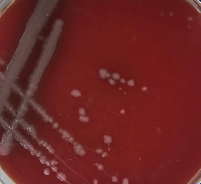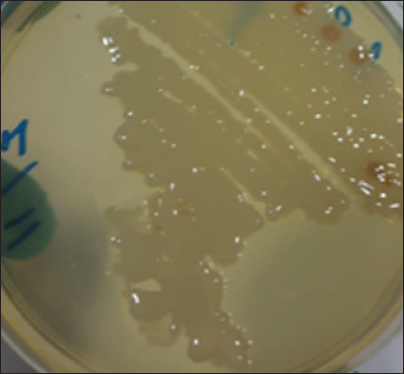 Fig. 3. Morphological characteristics of R. planticola: large, mucoid, gray, with gamma-hemolytic characteristics on blood agar. Large, mucoid, gray colonies with gamma-hemolytic characteristics were observed on the blood agar (Fig. 3). Under a light microscope (Fig. 4), R. Planticola are short, straight, gram–negative rods arranged singly or in pairs, as described by Morse et al. (2013). The isolates were positive for catalase, negative for oxidase, negative for indole, and positive for urease (Macfaddin, 2000). The purity of the R. planticola isolate was confirmed by the VITEK 2+ system, which consists of 64 biochemical tests (Table 1). The Vitek2 system was used to confirm the identification of the R. planticola isolate (Espinar et al., 2011).