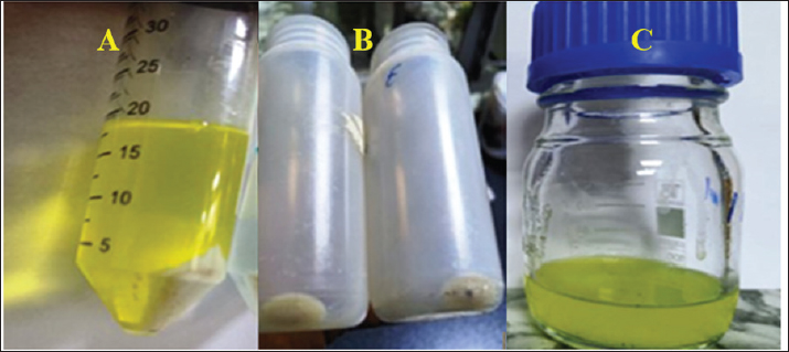 Fig. 6. Extraction (after centrifugation, A: Supernatant, B: Precipitant) and purification (C) of pigments. Table 2. FITR peak values and the function of the pigment extract; absorption spectra of the purified pigment.