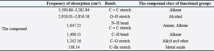 FTIR analysisThe FTIR spectrum determined the functional groups (Table 2 and Fig. 5). The alkene C=C stretching mode was responsible for the prominent peak observed at 3,390.86–3,282.84 cm−1. Crystallographic O-H stretch or alcohol molecules were likely present based on the peak characteristics at 2,926.01–2,856.58 cm−1. The broad peak at 1,647.21 cm−1 is credited to the extending mode of the N–H bend and C=C stretch (Amine, Alkene). Other crests found: The peak 1,406.11 cm−1 extending mode of the C–H bend (Alkane). The frequency 1,242.16 cm−1 extending mode of the C–O stretch (Alkyl aryl ether). The frequency 538.14 cm−1 extending mode of the C–Br stretch (Metal Oxide). Based on the peak value of the IR radiation region, the FTIR spectrum was used to determine the functional group of the active chemical in the pigment extracts. After determining the functional groups of the pigment extracted from R. platicola, the pigment (Fig. 6) was approximately 0.83 g/400 ml (Padhan et al., 2021).