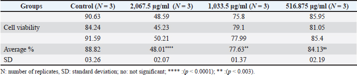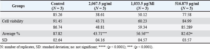 Table 4. Cytotoxic effect of extracted pigment on REF proliferation (cell viability%) at various concentrations.
