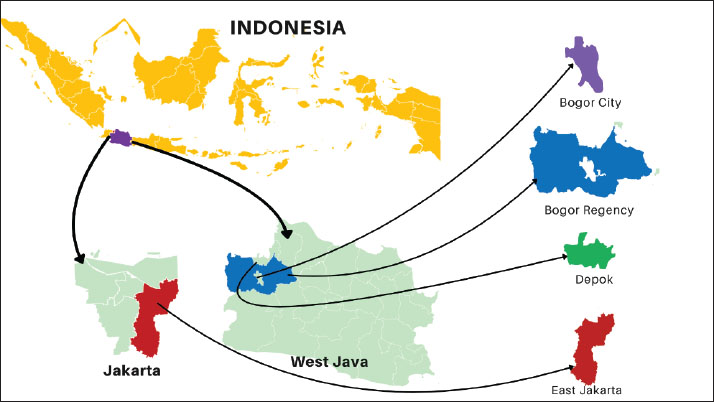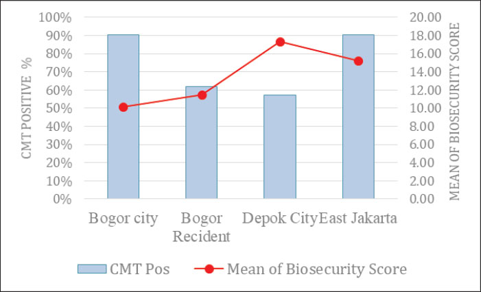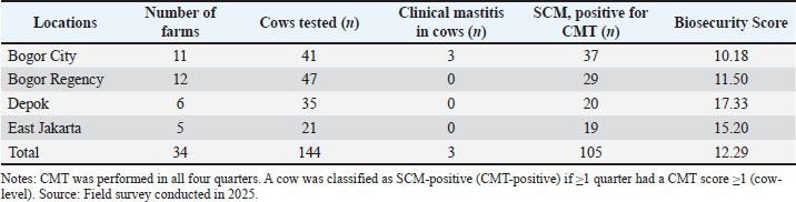 Fig. 1. Study site in peri-urban dairy farming areas of Indonesia (Source: Authors’ own elaboration). Sampling and participantsFarms were approached through local dairy networks/cooperatives in each district. Eligibility criteria were as follows: (i) peri-urban smallholder dairy farm, (ii) availability of lactating cows at the visit, and (iii) willingness to participate in the interview, observation, and CMT testing. Of the 40 farms contacted, 34 met the eligibility criteria and provided complete data; 6 were excluded (2 declined to participate, and 4 had insufficient lactating cows available for CMT testing). All lactating cows present at the visit were tested (n=144). While purposive sampling allows targeting farms relevant to the study objectives, it may introduce selection bias because participating farms might systematically differ from non-participating farms in terms of management practices or in the adoption of biosecurity measures. We cross-verified farm characteristics (herd size and location) with regional agricultural census data to mitigate potential bias and found no significant differences (p > 0.05, chi-square test). The relatively small sample size and the non-random selection of farms may lead to potential sampling errors, which may limit the precision of prevalence estimates and the generalizability of the findings. Results may not fully represent all smallholder peri-urban dairy farms in the region, particularly those less willing to participate or with distinct management practices. Despite these limitations, the sampling strategy was considered appropriate for generating preliminary insights and identifying associations between biosecurity practices and SCM in resource-limited peri-urban settings (Das et al., 2018). Herd size classificationFarms were classified into three herd-size categories based on the number of lactating cows present at the visit: small-scale (<5), medium-scale (6–20), and large-scale (>20). In this study, 4 farms were small-scale, 20 medium-scale, and 10 large-scale. These thresholds reflect the typical structure of smallholder dairy production in Indonesia. In West Java, most dairy farms are small-scale, with an average of 3 lactating cows per household (Fadillah et al., 2023). Consistent with the more intensive peri-urban context of Greater Jakarta, the sample included a higher proportion of medium- and large-scale farms. Data collectionData confidentiality was maintained through anonymization. Data were collected through three complementary approaches: (a) structured interviews captured farmer demographics (age, education, and farming experience) and farm characteristics (herd size and location); (b) on-farm observations verified the implementation of biosecurity measures and cross-checked interview responses; and (c) milk sampling was performed during the same visit to minimize disruption to routine farm activities. The questionnaire focused exclusively on farm management and biosecurity practices. Interview responses were cross-checked with on-farm observations to minimize reporting bias. Nevertheless, some practices (e.g., udder antiseptic hygiene use and handling of a cow with mastitis) may not be directly observable during a single visit and, therefore, remain susceptible to recall or social desirability bias. Biosecurity assessmentBiosecurity practices were assessed using a validated questionnaire adapted from livestock health and hygiene guidelines (Pedersen et al., 2023). The instrument comprised three dimensions: external biosecurity (9 items; e.g., controlled farm entry, visitor/vehicle hygiene, quarantine practices, and feed/water protection), internal biosecurity (6 items; e.g., separation of clean/dirty areas, waste management, and availability of hygiene facilities), and procedural biosecurity (9 items; routine operational measures related to milking and hygiene, including udder hygiene, cleaning/disinfection routines, and handling of cows suspected of mastitis). Each item was scored dichotomously (1=implemented, 0=not implemented). Subscores were calculated for external (0–9), internal (0–6), and procedural (0–9) biosecurity and summed to obtain a total biosecurity score (0–24). Based on score distribution and prior validation (Pedersen et al., 2023), farms were classified as having adequate biosecurity (score ≥12; ≥50% compliance) or inadequate biosecurity (score <12). The cutoff was supported by pilot testing (n=5 farms) and expert consultation. Milk sampling and CMT analysisCMT scores were interpreted as follows: 0=negative, 1=trace/mild SCM, 2=moderate SCM; and 3=severe SCM (National Mastitis Council, 2017). CMT was performed on all four quarters of each lactating cow using the 0–T–1–2–3 scoring scale. The highest quarter score was used to classify the SCM status of each cow. For consistency, all tests were performed by two trained assistants under veterinarian supervision, with joint calibration and repeat scoring of ambiguous reactions. Cow-level SCM prevalence was calculated as the proportion of cows with CMT ≥1 within each farm. For farm-level inferential analyses (chi-square and logistic regression), each farm was classified as moderate (code 1) if at least one tested cow had the highest quarter CMT score of 2–3 and mild (code 0) otherwise. This pragmatic dichotomization distinguished farms with evidence of higher subclinical inflammation from those with only trace/mild reactions under field conditions. Statistical analysisAll data analyses were performed using the Statistical Package for the Social Sciences version 26. The descriptive statistics included frequencies, means, medians, standard deviations, and 95% confidence intervals. All inferential analyses were conducted at the farm level (n=34), consistent with farm-level biosecurity assessment. Bivariate associations between each biosecurity dimension (external, internal, and procedural) and farm-level SCM severity (0=mild, 1=moderate) 