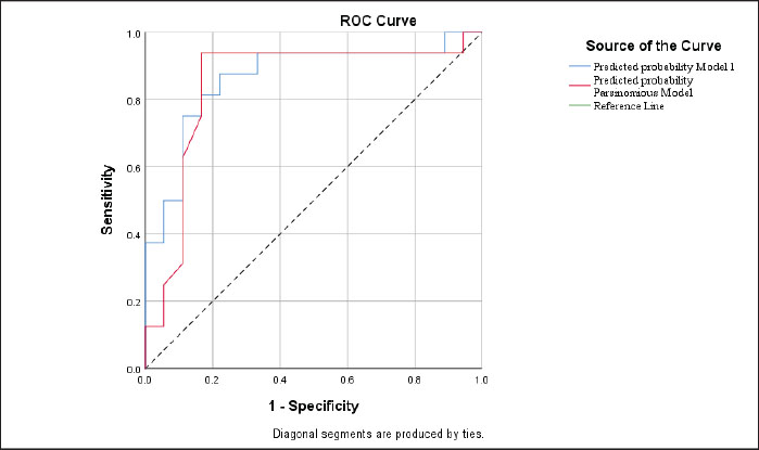 ROC curve analysisThe ROC curve analysis showed good discriminative performance for both models in distinguishing mild from moderate SCM. The full model achieved an AUC of 0.865, whereas the parsimonious model achieved an AUC of 0.845 (Fig. 3). A note of tied predicted probabilities was reported in the ROC output, which may slightly influence the AUC estimate precision. These findings indicate that both models can discriminate between mild and moderate SCM (Fig. 3).