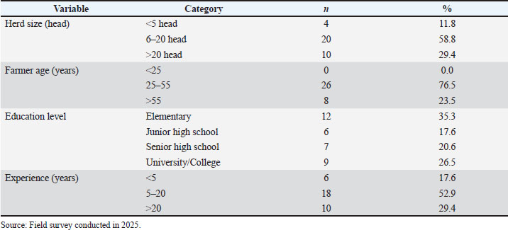 where p is the predicted probability that a farm was classified as moderate (1) rather than mild (0), statistical significance was set at p < 0.05. Ethical approvalNot needed for this study. The study involved non-invasive procedures (questionnaire-based interviews and on-farm observation) and excluded biological sampling beyond routine farm practice. All participants provided verbal informed consent before data collection. The ethical review requirement was determined in accordance with the applicable institutional/national guidelines. ResultsFarm characteristics and characteristicsA total of 34 smallholder dairy farmers were included in the analysis. Table 1 summarizes the characteristics of the participating farms. Most farms (58.8%) maintained 6–20 lactating cows, 29.4% had more than 20, and only 11.8% had 5 or fewer. Most farmers were in the productive age group of 41–55 years (72.4%), with a predominance of low educational attainment; nearly half (48%) had only completed elementary school, and only 7% had tertiary education. Farming experience varied, with most farmers having 5–20 years (52.9%), followed by those with more than 20 years (29.4%), while only 17.6% had less than 5 years. This predominance of moderately experienced farmers is consistent with previous findings in Bogor, where experience significantly influenced farmers’ knowledge, attitudes, and practices in livestock disease control programs (Kustiningsih et al., 2023). Table 1. The characteristics of participating farms and farmers are summarized.
