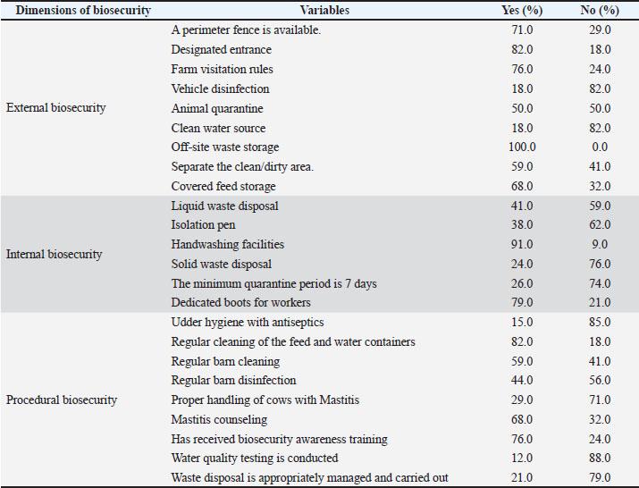Fig. 2. CMT positivity percentage and mean biosecurity score by location. (Source: Authors’ own data analysis, 2025). Biosecurity implementationExternal biosecurity was implemented in a variety of ways: off-site waste storage was universal (100%), and most farms reported a designated entrance (82%) and visitor rules (76%). Covered feed storage was reported by 68%, whereas vehicle disinfection and access to a clean water source were rare (both 18%) (Table 3). Basic facilities dominated internal biosecurity, with handwashing facilities (91%) and dedicated boots for workers (79%) being the most common, while isolation pens (38%) and a minimum 7-day quarantine period (24%) were less frequently reported (Table 3). Procedural biosecurity practices were generally higher for routine cleaning and training, regular cleaning of feed/water containers (82%) and training (76%), but critical practices such as water quality testing (12%), udder hygiene with antiseptic (15%), and proper handling of mastitis cows (29%) remained limited (Table 3). Table 3. Parameters for external, internal, and procedural biosecurity assessment in dairy cattle farms.