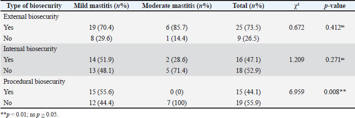 Association between biosecurity and severity of SCMChi-square analysis showed no significant association between external or internal biosecurity and SCM severity (external: χ²=0.672, p=0.412; internal: χ²=1.209, p=0.271). Procedural biosecurity was significantly associated with SCM severity (χ²=6.959, p=0.008) (Table 4). Given the presence of a zero cell, the association was also checked using an exact test, yielding consistent significance (p < 0.05). Notably, all moderate SCM cases occurred in farms without procedural biosecurity (7/7; 100%), whereas none were observed in farms with procedural biosecurity (0/15; 0%). Table 4. Chi-square results between biosecurity and SCM severity level (mild vs. moderate).