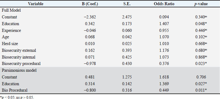 Binary logistic regression of biosecurity predictors of mastitisBinary logistic regression was performed to identify farmer- and farm-level SCM severity predictors (0=mild; 1=moderate). In the full model (Model 1), education level was positively associated with the odds of moderate SCM [odds ratio (OR)=1.407, 95% confidence interval (CI): 1.003–1.975; p=0.048], whereas adequate procedural biosecurity was associated with lower odds of moderate SCM (OR=0.376, 95% CI: 0.162–0.874; p=0.023). Other covariates (experience, age, flock size, and external and internal biosecurity) were not herd size different (p > 0.05). The parsimonious model (Model 2), including only education and procedural biosecurity, produced consistent estimates (education: OR=1.369, 95% CI: 1.036–1.809; p=0.027; procedural biosecurity: OR=0.449, 95% CI: 0.242–0.835; p=0.011). The detailed regression results are presented in Table 5. Table 5. Binary logistic regression analysis of factors associated with SCM.