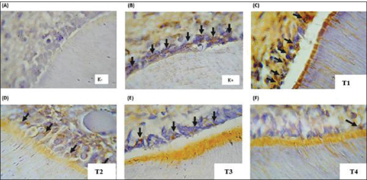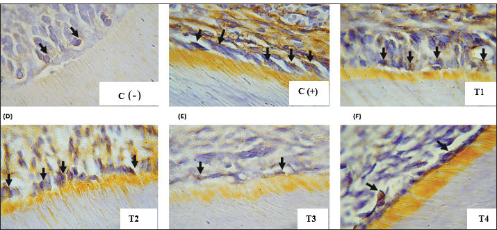 Fig. 1. Expression of IL-1β in Odontoblast cells of rat dental pulp tissue (Immunohistochemistry, 400×). IL-1β expression is indicated by brown staining in the cytoplasm of odontoblast cells (black arrows). Odontoblast cells are arranged along the pulp chamber periphery in the maxillary first molar of rats. Representative micrographs show the following: (A) Negative control—minimal IL-1β expression, with only a few positively stained cells visible; (B) Positive control (pulpitis)—the strongest immunoreactivity, indicated by intense brown coloration in most odontoblasts; (C) NE-RO 0.5 mg/ml—moderate staining intensity; (D) NE-RO 1 mg/ml—mild expression pattern; (E) NE-RO 2 mg/ml—very faint staining, almost comparable with the negative control; (F) Eugenol treatment—mild to moderate IL-1β positivity. Micrographs are original images obtained from the authors' own experimental study.