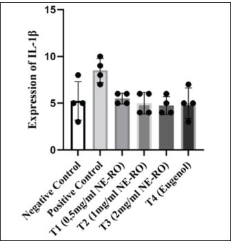 Fig. 2. Quantitative analysis of IL-1β expression in the odontoblast layers. The bar chart (mean ± SD) indicates that IL-1β-positive cells were most abundant in the positive control group (8.5 ± 2.65 cells/field). Treatment with R. officinalis nanoemulsion at all tested concentrations resulted in a gradual reduction in IL-1β expression, but the overall differences among groups were not statistically significant (Kruskal–Wallis test, p > 0.05). Expression of NK1-RA significant overall treatment effect was detected for NK1-R expression (p < 0.05, Kruskal–Wallis test). The untreated pulpitis group displayed the highest number of NK1-R-positive cells (10 ± 0.41 cells/field). In contrast, the administration of NE-RO at 2 mg/ml (T3) led to a marked decline in NK1-R-positive cells, reaching 5.5 ± 0.29 cells/field. Treatments with 1 mg/ml NE-RO (T2) and eugenol produced comparable results, both averaging around cells/field (6.25 ± 0.25 and 7.0 ± 0.41, respectively). The lowest concentration group, T1 (0.5 mg/ml), showed a moderate reduction to 8.0 ± 0.41 cells/field; however, this change did not differ significantly from the positive control (Figs. 3 and 4).
