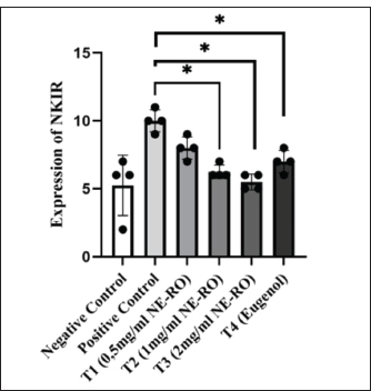 Fig. 4. NK1-R expression after NE-RO treatment. The bar graph presents the mean number of NK1-R–positive cells across the experimental groups. The positive control group showed the highest NK1-R expression (10.00 ± 0.41 cells/field). In contrast, treatment with NE-RO at a concentration of 2 mg/ml (T3) resulted in a marked reduction in NK1-R–positive cells (5.50 ± 0.29 cells/field), reaching values comparable to those observed in the eugenol-treated and other treatment groups. Statistical analysis using the Kruskal–Wallis test demonstrated significant differences among groups (p < 0.05). Asterisks indicate statistically significant differences relative to the positive control. Expression of the substance PAnalysis of variance (one-way) revealed a clear difference in the expression of substance P among the groups (p < 0.001). The positive control exhibited the highest mean value (9.25 ± 0.48 cells/field), whereas the negative control had a considerably lower count (5.25 ± 1.10 cells/field). Treatment with 2 mg/ml rosemary nanoemulsion (T3) resulted in the greatest reduction in Substance P expression (5.00 ± 0.41 cells/field), exceeding the effect observed with eugenol and other treatment groups. Eugenol treatment (T4) resulted in Substance P expression of 5.25 ± 0.63 cells/field, whereas intermediate doses of rosemary nanoemulsion (T1: 0.5 mg/ml and T2: 1.0 mg/ml) reduced the expression of Substance P to 7.0 ± 0.91 and 6.25 ± 0.63 cells/field, respectively, compared with the positive control group (Figs. 5 and 6).