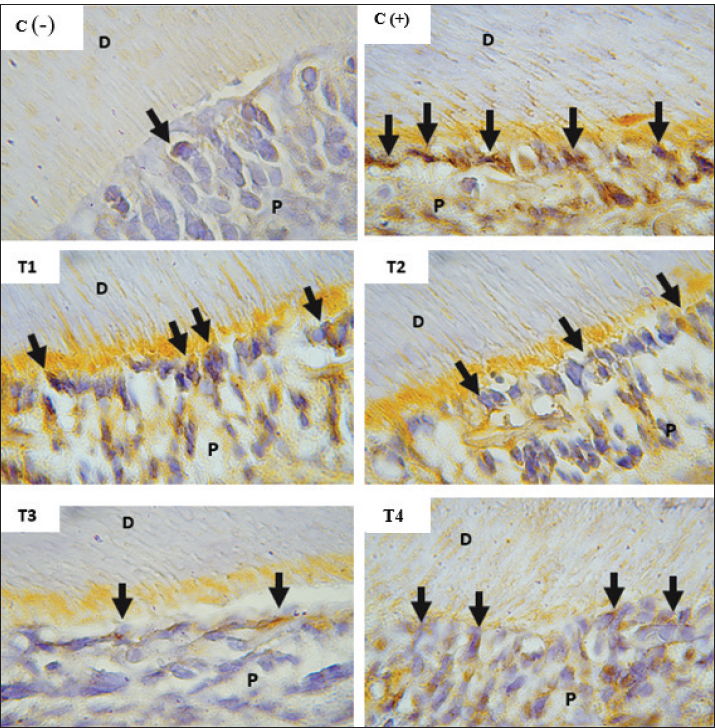 Fig. 5. Fig. 5. Substance P expression in odontoblast cells of rat dental pulp tissue (Immunohistochemistry, 400×). Substance P (SP) expression is indicated by brown staining in the cytoplasm of odontoblast cells (arrows). The odontoblast layer is observed along the pulp chamber edge (P) adjacent to the dentin (D). (a) Negative control group [C(–)] showing minimal SP expression with fewer stained cells. (b) Positive control group [C(+)] (pulpitis) demonstrating the highest SP expression, indicated by strong brown staining intensity. (c) Group treated with rosemary nanoemulsion [T1] (NE-RO) 0.5 mg/ml, showing moderate SP expression. (d) Group treated with NE-RO [T2] 1 mg/ml, displaying mild SP expression. (e) Group treated with NE-RO [T3] 2 mg/ml, exhibiting the lowest SP expression, comparable to the negative control group. (f) Group treated with eugenol [T4], showing mild-to-moderate SP expression. Immunohistochemical staining using DAB-HRP with hematoxylin counterstain, original magnification 400×. One-way ANOVA revealed significant differences among groups (p < 0.001). Micrographs are original images obtained from the authors' own experimental study.