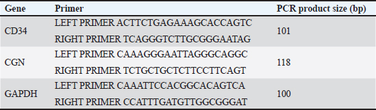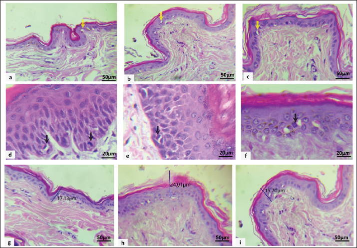 Fig. 1. Microscopic appearance of apoptotic cells (yellow arrows) within the epidermis of the back (a), face (b), and leg (c). MFs (black arrows): metaphase and telophase in the back (d), telophase in the face (e), and metaphase in the leg (f). Epidermal thickness measurements of the back (g), face (h), and leg (i) using H&E stain. Mitotic indexThe mitotic index is the ratio of the number of mitoses to the total number of interphase nuclei counted, usually assessed at 1,000× magnification. The mitotic index addresses the variability in cell size and High power field (HPF) (high power field) area (Fig. 1d–f).The mitotic cells or dividing cells were counted over 10 fields, or in 2.37 mm², which is the mitotic count/mitotic index, which was recommended to count both mitotic figure (MF) in an area of 2.37 mm². The total MF in 2.37 mm² is the Mitotic cell per HPF (Donovan et al., 2021). Then, statistical analysis was performed using GraphPad Prism. Figure 1 shows the different phases of MFs within the epidermis. Epidermal thickness assessmentEpidermal thickness (measured by µm) was assessed by measuring the total layers of the epidermis, nucleated epidermis, and stratum corneum thickness in individual healthy dogs. Epidermal thickness was measured in three variable-thickness randomly selected fields of each sample (AmscopeTM, Japan) to measure the epidermal thickness in all three different epidermal regions (Fig. 1g–i). The data were transformed to GraphPad Prism 10 for statistical analysis. Molecular analysisTotal RNA was extracted from the skin samples using the AddPrep Total RNA Extraction Kit (Daejeon, Republic of Korea) according to the manufacturer’s instructions (Addbio). Total RNA was extracted from tissue samples using a spin column extraction method based on a silica membrane. In brief, 25–100 mi of tissue was homogenized and lysed in lysis buffer supplemented with β-mercaptoethanol and proteinase K, followed by incubation at 56°C for 10 minutes. The clarified lysate was combined with binding buffer and absolute ethanol after centrifugation to promote RNA adsorption onto the silica membrane. The mixture was then transferred to spin columns and centrifuged to allow binding of RNA. The bound RNA was washed sequentially using two washing solutions to remove proteins and other contaminants. An on-column DNase I digestion step was performed at room temperature for 15 minutes to eliminate residual genomic DNA. Following additional washing steps and membrane drying, total RNA was eluted in 50–100 µl of RNase-free elution buffer. Purified RNA was immediately used or stored at −70°C until further analysis. Primer design and cDNA synthesisThe transcript sequences for CD34 and CGN were sourced from the canine genome transcript sequences available on NCBI (USA), specifically CD34 (accession no. NM_001003341.1), CGN (accession no. NM_001103217.1), and GAPDH (accession no. NM_001003142.2). Primers were designed using Primer3 software and subsequently verified through BLAST analysis for homologies. The primer sequences and anticipated product sizes are presented in Table 1. Table 1. Sequences and anticipated PCR product sizes of the qPCR primers.