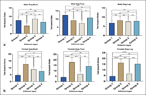 Fig. 2. Apoptotic body count in male (a) and female (b) dogs of different ages. Group 1 (6 month-1 year), Group 2 (1–2 years), Group 3 (2–4 years) and Group 4 (4–6 years). Data are mean ± SE; one-way ANOVA was used. Significance: (p ≤ 0.05), * (p ≤ 0.0332), ** (p ≤ 0.0021) and *** (p ≤ 0.0002). In all regions of female dogs, group 2 showed the highest number of apoptotic bodies with a clear significant difference (p < 0.05), followed by group 4 (Fig. 2b). MFs were observed in all different epidermal regions of both male and female dogs. For male groups generally in older ages (3 and 4), showing an increase in the number of MFs with a clear, significant difference (p < 0.05) particularly at back and leg regions compared with younger ages (Fig. 3a). Furthermore, in female dogs, the MF count increased in the youth and oldest groups in the back and face regions, with a significant difference (p < 0.05) among the other groups. However, in the leg region, a high number of mitotic counts was detected in groups 2 and 4 with a significant difference (p < 0.05), and the young one showed a high mitotic count (Fig. 3b).
