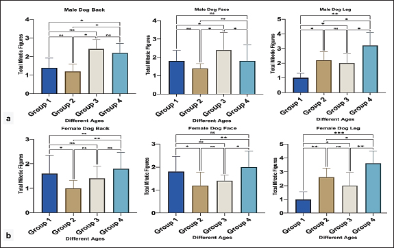Fig. 3. Mitotic count in male (a) and female (b) dogs of different ages. Group 1 (6 month-1 year), Group 2 (1–2 years), Group 3 (2–4 years) and Group 4 (4–6 years). Data are mean ± SE; one-way ANOVA was used. Significance: (p ≤ 0.05), * (p ≤ 0.0332), ** (p ≤ 0.0021). Variations in epidermal thicknessSkin histologyThe skin of dogs showed a thin epidermis with few epidermal papillaes. The dermis is composed of papillary and reticular layers, where numerous compound hairs are found. A few sweat and sebaceous glands were found in association with hair follicles. The skin of all different regions (back, face, and leg) was composed of at least two to four well-defined nucleated epidermal layers. The canine skin was divided into four layers, including the stratum (s.) basale, s. spinosum, s. granulosum, and keratinized epidermis (SC). The dermis contained a matrix of connective tissue and epidermal appendages, such as hair follicles, sebaceous glands, apocrine glands, exocrine glands, and a few mononuclear cells (Fig. 4c–e)