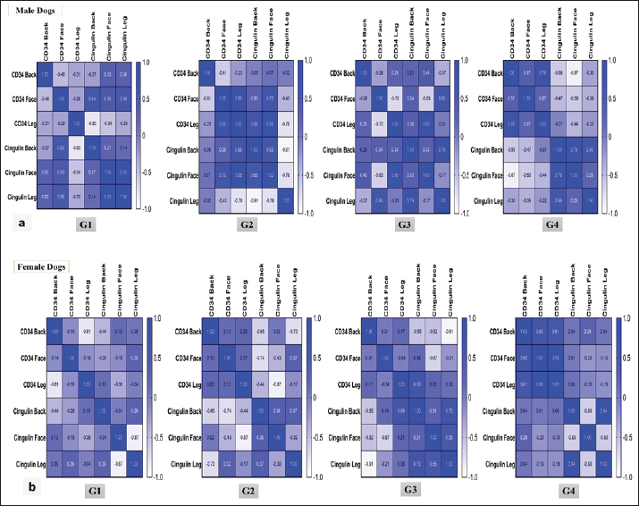 Fig. 5. Heat map Pearson’s correlation of mRNA expression levels of CD34 and CGN genes in three regions of different sexes and ages dogs. In female dogs, the correlation in groups 1 and 2 was negative in all regions for both CD34 and CGN genes. In group 3, a negative correlation was observed in the back and face regions, and a poor positive correlation was observed for the leg region. In group 4, the correlation between two genes was positive in the back and negative in the face and leg (Fig. 5b). Localization of proteins by immunohistochemistryImmunostaining of the skin for CD34 protein expression was localized in the keratinocytes of the epidermis and the hair follicle bulge. In male dogs, the immunoreactivity in group one showed an increase in the intensity and proportion of IHC-positive cells in the leg (Fig. 6e and f), followed by the back region (Fig. 6a and b), while weak expression was seen in the face region (Fig. 6c and d). Thus, the peak score was observed in the leg, followed by the back and face (Fig. 8a). Compared with group two, the immunoreactivity of this factor reached the peak score, particularly in the leg and then back regions (Figs. 6g–l and 8a), the expression at the face increased to weak-moderate expression (Fig. 6i and j) versus group three, and the same immunoreactivity level of this protein was observed to a moderate degree and scored as 9 (Fig. 6m–r). The aged group (group 4) exhibited a moderate expression of CD34 in the leg compared with the back and face regions (Fig. 6s–x).