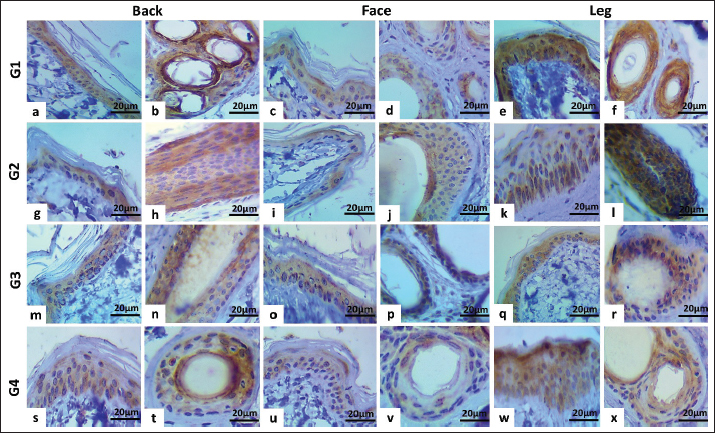 Fig. 6. Immunohistochemical staining of CD34 cytoplasmic expression in the epidermis and hair follicles of different male’s aged dogs: a and b: Moderate positive staining (score 9, 65%). c and d: Weak-moderate positive staining (score 6, 60%). e and f: Moderate-strong positive staining (score 12, 65%). g and h: Moderate positivity (score 9, 65%). i and j: weak-to-moderate positive staining (score, 6%; 50%). k and l: strong positive staining (score, 15%; 60%). m–r: moderate positive staining (score 9, 65%). s and t: weak-to-moderate positive staining (score, 55%; score, 6%). u and v: Weak-moderate positive staining (score 6, 45%). w and x: Moderate positive staining (score 9, 45%). In the female group, the CD 34 expression in group one was moderately intense in all regions, with a different proportion versus group two, with the highest expression seen in the face region, followed by the back and leg regions (Fig. 8b). In group 3, similar immunohistochemical patterns were found. The aged group exhibited moderate expression of CD34 in the back and leg compared with the face, which showed weak-moderate expression (Fig. 8b).
