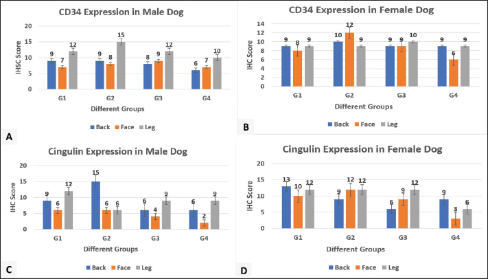 Fig. 8. Immunohistochemical scoring column charts. A and B: CD34 expression in male and female dogs. C and D: CGN expression in male and female dogs. CGN is expressed cytoplasmically in the keratinocytes of the epidermis and varies in degree according to sex and age. In male dogs, group one showed the highest score in the leg region, followed by the back, while the least expression was seen in the face region (Fig. 8c). In group two, the highest expression was seen in the back region (Fig. 8c). In group three, the CGN expression showed the maximum level in the leg and the lowest degree in the face region (Figs. 7g–i and 8c). Group four had the same pattern of CGN expression in the back (weak-moderate) and face (weak) as the leg region in which the expression level was high (Fig. 8c).