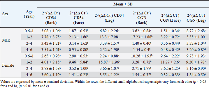 In Table 2, for the female group, the CD34 gene in group one was expressed at the same level, whereas the CGN gene was expressed at the maximum level in the back (10.26 ± 1.93), then in the face and leg significantly (p < 0.05). Regarding group two, CD34 was detected at a maximum level in the leg versus the face and back versus the CGN, with the highest ratio (11.27 ± 2.6) being seen in the face significantly (p < 0.05). The CD34 and CGN values in group three did not show any difference, except that the back region (2.71 ± 1.77) for CGN decreased significantly (p < 0.05). In the aged group, both genes decreased significantly (p < 0.05) in the face region (1.41 ± 0.23) for CD34 and for CGN (0.32 ± 0.33). Correlation between CD34 and CGN gene expression in the same skin regions in different sexesFor male dogs, the correlation between CD34 and CGN showed a weak negative correlation in the back and leg in group one versus the facial region, in which a weak positive correlation was observed. In group two, the back and leg expression correlation between both genes appeared to be negatively correlated, particularly a strong negative correlation in the leg region, whereas a strong positive correlation was observed in the face region. The correlation between both genes in group 3 was detected as poor positive in the back, strong negative in the face, and poor negative in the leg. In group 4, the expression correlation between CD34 and CGN was negative in all three skin regions (Fig. 5a).
