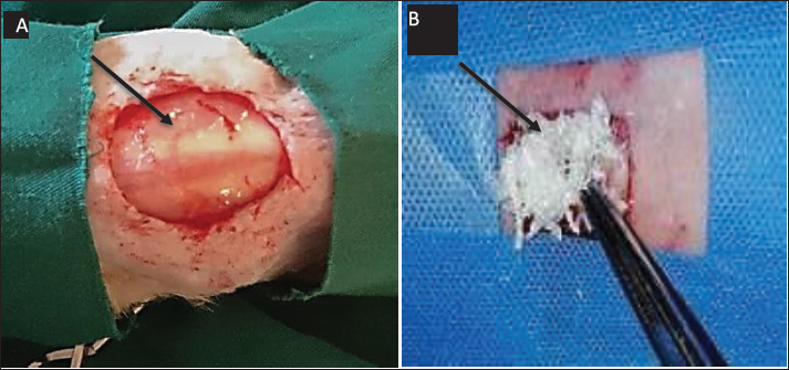 Fig. 1. Represents the Created (2 × 2 cm) on the dorsal area (A) the wound left untreated (as control group). While, the wound was treated with SIS-ECM powder (as treatment group). Histopathological evaluationRabbits were euthanized with ether on days 7, 14, and 35 post-injury. Biopsies of full-thickness incisional samples (5–6 mm) and adjacent normal skin (3–4 mm) were fixed in 10% formalin, dehydrated, cleared, and embedded in paraffin. Transverse sections (5 μm) were stained with hematoxylin and eosin (H&E) (Liu et al., 2011). Wound contraction measurementFor assessment of wound healing rate wound area were measurement daily from day 0 to 35. A standardized digital imaging was employed. Each wound was photographic daily by camera mounted. A calibration ruler was placed adjacent to the wound in each image, the wound perimeter was traced manually, and wound area was calculated in cm2 (Rao et al., 2007). The wound contraction percentage for each wound on day (7,14,21,35) was calculated by following formula % wound contraction=initial wound area-wound area on day n /initial wound area x 100 Statistical analysis of data was performed using t-test to compare between the two group with a p value (p < 0.05) considered statistically significant. Ethical approvalThis study was conducted in conformity with the rules of the Animal Ethics Committee of the Faculty of Veterinary Medicine at the University of Kufa (license number: 27865 in 13/10/2023). ResultsClinical evaluationDaily clinical observations of wounds refer to a rapid reduction in size in both treated and control groups over the study period. However, a marked improvement was observed in the treated wounds starting from day 7, demonstrating a faster clinical resolution compared to the non- treated wounds while a little significant variation in day 3 was observed . These distinct differences between the two groups persisted until day 35. The centers of the treated wounds had transitioned into mature scar tissue , while the control wounds remained visibly larger and less healed . The appearance of scar tissue in treated group commenced earlier , beginning from day 7 post-wounding, and this differentiation continued until the experiments conclusion (Fig. 2).