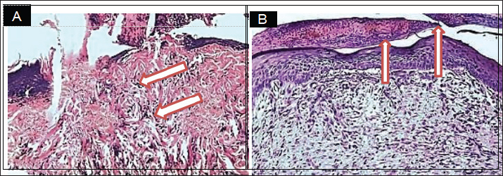 Fig. 3. Histopathological section, at 7 days PO, (A) in control group showed neutrophils and mononuclear cells infiltration in the immature granulation tissue (Red arrow). (B) in treatment group, showed granulation tissue in the dermis with complete epidermal layer (Red arrow). (H& E stain 100X). On 14 day epithelialization was complete in treated wounds, with the wound site densely filled by cohesive tissues and new collagen bundles (Fig. 4B). conversely, in control group displayed a persistence of delayed epithelial reorganization and fibrous tissue deposition (Fig. 4A). On day 35 Histological examination revealed near-complete recovery in the treated wound characterized by collagen reformation,skin keratinization, and the reappearance of hair follicles in the wound site (Fig. 5B). In contrast, the control wounds exhibited delayed healing, with advanced fibrosis and prominent scarring (Fig. 5A).