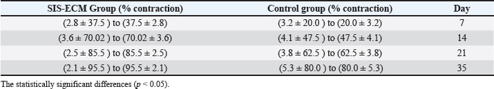 DiscussionSubmucosa of Small Intestine has been expansively employed for tissue regeneration as a totally decellularized matrix; skin replacement, vascular repair, and renewal of other soft tissues are among these applications (Luna, 1992). In the present study, it was observed that there was a swift reduction in the size of the wounds in both the treatment and control groups. However, according to histopathological section, the rate of wound closure was noticeably greater in the SIS-ECM treated wounds than in untreated. Wound healing has been evaluated by using a xenogeneic, collagen-rich membrane scaffold derived from the umbilical cord of cow. The examination of wound sections post-treatment through histopathology demonstrated a significant presence of well-developed granulation tissue, myofibroblasts, and newly formed blood vessels. Statistical analysis , performed using Students t-test with significance (p < 0.05) (Wasserstein et al., 2016). in contraction percentages at all measured time points (Table 1) demonstrate a consistent and sustained enhancement of the healing process. The most remarkable acceleration occurred during the initial two weeks, where the SIS-ECM group achieved nearly double the contraction rate of the control group by day 7 (37.5% vs. 20%). The early boost aligns with the critical inflammatory and proliferative phases of healing, suggesting that SIS-ECM actively modulates these stage rather than merely providing a passive scaffold. The progressive nature of wound closure, culminating in 95% contraction by day 35 in the treatment group compared 80% in controls (Field et al., 2013) however, the sections of wounds in the control group showed myo fibroblasts dispersed throughout fibrous connective tissue containing congested blood vessels. This finding can be connected to the impact of implanted SIS-ECM, which can contribute significantly to the acceleration and enhancement of cutaneous wound healing by helping infiltration, adhesion, as well as progenitor cell proliferation, and acceleration of formation of blood vessels at the wound site. Implantation of ECM has been demonstrated to facilitate tissue regeneration by stimulating infiltration, adhesion, and proliferation of progenitor cells, hastening angiogenesis at the wound site, augmenting formation of granulation tissue and encouraging the host-derived neomatrix to be deposited (collagen matters), thus minimizing scar tissue formation this was quantitavely confirmed by wound contraction measurement, which revealed a statistically significant (p < 0.05) (Luna et al., 1992; Luo et al., 2011). The research determined that cells engaged with regard to regenerative medicine and tissue engineering necessitate guidance for proliferation, morphogenesis, and differentiation. This guidance emanates from the microenvironment of cells and the surfaces of scaffolds or matrices which these cells interact. Rashtbar et al., 2018 and Schultz et al., 2009 mentioned that the surfaces of the scaffold or matrix that these cells contact with and the cellular microenvironment is the sources of this "instruction". SIS-ECM contained approximately 461 protein biomolecules, the majority of which were growth factors or cytokines involved in physiological procedures that involve homeostasis and tissue remodeling (Sheikh et al., 2014). It is important in the subject of both angiogenesis and cell proliferation, these include factors including platelet-derived growth factor AA and transforming growth factor beta 1 (TGF-1) (PDFG-AA) (Massee, et al., 2016). Chemokines, inflammatory modulators, and proteases and inhibitors, have also been identified (Shi et al., 2013). Serine and cysteine proteases, involved in the activation of proteins, together with matrix proteases and inhibitors including matrix metalloproteinase-1 (MMP-1) and MMP-3, as well as tissue inhibitor of metalloproteinases (TIMPs 1-2), were identified as key regulators of ECM changeover in the period of remodeling (Ramsay et al., 2012; Singh et al., 2022). Curcumin in decellularized goat small intestine submucosa for wound healing and skin tissue engineering. Journal of Biomedical Materials Research Part B: Applied Biomaterials, 110(1), 210–219]. The soluble protein analysis demonstrates that SIS-ECM is a physiologically active tissue that has a wide variety of signaling components that are able to stimulate responses that take place during tissue regeneration. Placental-derived graft, which has been shown to be effective in treating leg ulcers caused by veins and non-healing refractory wounds, also contains similar factors (Tan et al., 2009; Voytik‐Harbin et al., 1997). As a result, it is anticipated that SIS grafts may also have the therapeutic potential to promote wound closure in chronic wounds. Since SIS-ECM is a naturally occurring scaffold that encourages cellular attachment and proliferation and is both biocompatible and biodegradable, we believe that it has desirable characteristics in place of the advantages and disadvantages of normal and artificial scaffolds. When compared to autologous one, allogeneic and xenogeneic grafts have a lower threat of infection or immune rejection (Ji et al., 2019). Clinical and histopathological observations indicated that human umbilical cord (HUC) usually connected with tissue acceptance, and in spite of implant's xenogeneic character, no indications of immunological rejection were seen. The implant's composition, which primarily consisted of collagen-based biomaterial that is resorbable, non-immunogenic, and acellular, may be responsible for this outcome. The statistical significant of these histological improvement reinforce the biological relevance of our finding. The introduction of the small intestine submucosa scaffold triggers an immune response characterized by predominantly T- helper lymphocyte-2-like activity, that promotes secretion of interleukins (IL-4, IL-5, IL-6, and IL-10) (Yeum et al., 2013). In previous investigati