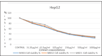 Fig. 1. Antiproliferative activity of the combined extracts against the Hep-G2 cell line after 24 hours incubation at 37oC and 5% CO2.