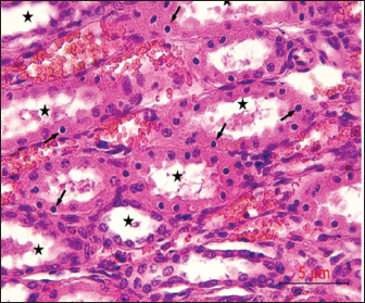 Fig. 7. Histological section of the kidney showing dilatation of renal tubular lumina (asterisk), with karyopyknosis of the lining epithelial cells (arrows), H&E,40x. Scale bar=5µm.