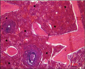 Fig. 8. Histopathological evaluation of the spleen showed a marked reduction in the proportion of white pulp (white asterisk) relative to red pulp (black asterisk), H&E,4x. Scale bar=5µm.