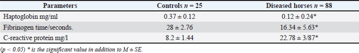 Acute phase responseResults from the evaluation of the acute phase response in diseased horses in the current study show a significant decrease (p < 0.05) in haptoglobin levels and fibrinogen time in diseased horses compared to controls. In contrast, significant increases in C-reactive protein were observed in horses infected with Hemomycoplasma compared to controls Table 2. Table 2. Acute phase response shift of horses indicates a hemolytic response typical of hemoplasma haemofelis infection and controls.