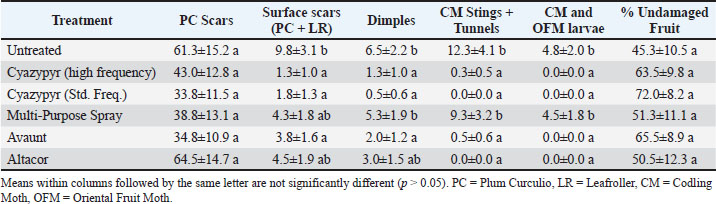 Conversely, none of the insecticide programs significantly reduced the number of plum curculio (PC) oviposition scars at harvest compared with the untreated control (Table 3). This is a critical finding, particularly for Program 5 (Assail/Altacor/Delegate), which included an early-season application of acetamiprid (Assail), an insecticide rated effective against PC (Wise et al., 2009). The lack of significant control suggests that a single early application was insufficient to suppress season-long PC pressure, which often involves continuous adult immigration from peripheral habitats throughout the early and mid-season (Leskey et al., 2012). This failure could be attributed to several factors: a potential mismatch between the single early spray and prolonged PC immigration/migration events, the shorter residual activity of reduced-risk insecticides compared to older organophosphates, and/or the limited contact efficacy of foliar applications against a pest whose larvae develop protected inside the fruit. Furthermore, the numerically high mean for PC scars in the chlorantraniliprole-based program (Program 5) compared with the control, which is an unexpected result, warrants data verification and may reflect high plot-to-plot variability or localized conditions that compromised control efficacy in specific replicates. Although not statistically analyzed in this study, visual observation indicated potential variation in susceptibility to PC damage among the six apple cultivars used; future work should explicitly investigate cultivar x treatment interactions. DiscussionCyantraniliprole performance and implications for integrated pest managementThe results demonstrate that the experimental reduced-risk insecticide, cyantraniliprole, in this 2013 trial, can provide control of key Lepidopteran pests comparable to or better than established standards like chlorantraniliprole and indoxacarb. Crucially, the standard-frequency program (Program 3) performed as well as the high-frequency program (Program 2) against most harvest-time pests, indicating the potential for reducing application frequency, thereby lowering production costs and environmental impact without compromising control efficacy (Van Bruggen et al., 2018). This finding aligns with current IPM principles advocating for precision targeting and reduced insecticide loads (Hill et al., 2021). A preliminary cost comparison based on 2013 prices indicated that the standard-frequency cyantraniliprole program (Program 3) could offer cost savings compared to the high-frequency program (Program 2) and was competitive with programs based on chlorantraniliprole and indoxacarb, primarily due to reduced application costs. However, the actual economic viability of high-quality fruit depends on local insecticide prices, application costs, and market premiums. This position cyantraniliprole as a promising addition to apple integrated pest management (IPM) programs. In stark contrast, the consistent failure to achieve significant control of plum curculio across all programs underscores the limitations of relying solely on insecticides and highlights the need to integrate non-chemical management tactics. This could include strategies such as targeted border-row sprays, trap crops to divert pests from the main orchard block, or physical trunk barriers to prevent weevils from ascending trees (Piñero and Dudenhoeffer, 2018). Recent extension recommendations also highlight the potential of newer chemical classes and refined application timings for PC management (Richardson and Murray, 2024), which should be integrated with the foundational data presented here. Moreover, recent research continues to emphasize that a multi-tactic approach, combining behavioral, cultural, and chemical controls, is often required for successful PC management (Agnello et al., 2023). Furthermore, the development of resistance to diamide insecticides in codling moth populations necessitates the adherence to IRM strategies, such as rotating modes of action, even when using effective reduced-risk products, such as cyantraniliprole. Proactive IRM is now considered essential for preserving the efficacy of diamides in tree fruit systems (Sial et al., 2024). ConclusionWhile reduced-risk insecticides such as cyantraniliprole provide excellent control of Lepidopteran pests, a holistic IPM approach is required for the sustainable management of the full complex of direct apple pests. Future research should focus on developing integrated strategies for plum curculio management, optimizing new insecticide use patterns, and validating these approaches in multi-year, multi-location trials. This study provides a valuable snapshot of the 2013 insecticide efficacy. Future work must incorporate contemporary pest pressures, resistance status, and the full arsenal of modern IPM tools, including newer insecticides, biological controls, and behavioral manipulation techniques, to remain relevant. AcknowledgmentsThe authors would like to thank the technical staff at the University of Illinois Fruit Research Farm for their assistance. FundingThis study received no external funding. Authors' contributionsThe authors have contributed equally to this study. All authors have read and approved the final version of the manuscript. Conflict of interestThe authors declare no conflict of interest. Data availabilityAll data are provided in the revised manuscript. ReferencesAgnello, A.M., Jentsch, P. and Weires, R. 2023. Orchard Pest Management: a Holistic Approach for the Management of Plum Curculio. Pest. Manage. Sci. 31, 15–21. Agnello, A.M., Reissig, W.H., Kovach, J. and Nyrop, J.P. 2009. Reduced-risk insecticide programs for plum curculio and apple maggot in New York apples. J. Econ. Entomol. 102, 1397–1407; doi:10.1016/j.jeento.2013.09.010 Beers, E.H., Cockfield, S.D. and Gontijo, L.M. 2010. Biology and management of the San Jose scale (Hemiptera: Diaspididae) in apple orchards in Washington State Wash. Sta