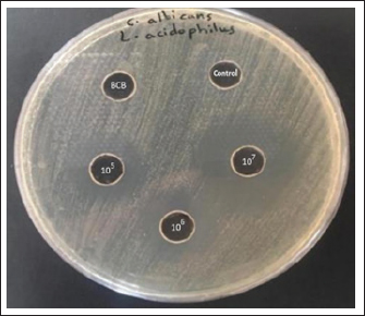 Antifungal activity evaluation probiotic (Lactobacillus acidophilus)The agar well diffusion methods demonstrated that L. acidophilus cell-free liquid at three concentrations (105, 106, 107) inhibited the growth of C. albicans. Three levels of Lactobacillus acidophilus were tested: C albicans was inhibited best at the CSF concentration (107), as it shown in (Fig. 6). The inhibition results were compared specifically with clotrimazole, as the isolates showed clear sensitivity to this antifungal agent. These results were documented by stabilizing the diameters of the inhibition for both L. acidophilus and clortimazole with similar values as 9 mm for L acidophilus at the CSF concentration (107) and 10 mm for clotrimazole.