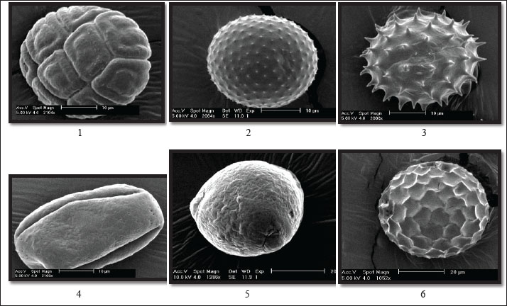 Fig. 1. Scanning electron microscopy images showing the morphology of the major trapped pollen types collected from the experimental colonies, Narrabri, 2005. (1: Acacia concurrens Pedley, 2: Maireana villosa (Lindl.) Paul G. Wilson, 3: Helianthus annuus L., 4: Unknown species, 5: Melaleuca quinquenervia (Cav.) S.F. Blake, 6: Tribulus micro-coccus Domin). Smooth to slightly granular textureThis group included M. villosa, which has oval-shaped grains with the smallest size (31 µm) and the highest pellet weight (6.42 mg). An unidentified species also fell into this category, featuring medium-sized grains (45 µm) with a regular rectangular appearance and a pellet weight of 5.42 mg. Acacia concurrens also belongs to this group, characterized by spherical grains divided into multiple polygonal sections resembling a honeycomb or quilted structure, with a size of 36 µm and an average pellet weight of 5.93 mg. Reticulate (Net-like) textureThis category includes M. quinquenervia, which has spherical to subprolate medium-sized grains (40 µm) and a pollen pellet weight of 5.93 mg. Tribulus micrococcus also belongs to this group, exhibiting polygonal to slightly oblate medium-sized grains (41 µm) with a scabrate to reticulate surface and a pellet weight of 5.50 mg. Spiny (echinate) textureThis group included H. annuus, which had small spherical to elliptical grains (30 µm) covered in spines and a pellet weight of 4.69 mg. Gossypium hirsutum had the largest grains (101 µm) with a granular texture and fine protrusions (Fig. 2), but had the smallest pellet weight (2.45 mg).