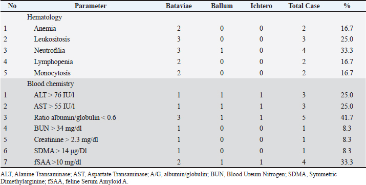 Among the seropositive cats, 25% showed mild to moderate increases in alanine aminotransferase (ALT) and aspartate aminotransferase (AST) levels, indicating hepatocellular involvement. Additionally, 41.7% of patients had decreased albumin–globulin ratios or elevated total bilirubin, indicating impaired hepatic function or cholestatic changes. Increased feline serum amyloid A (fSAA) levels in 33.3% of cats reflected ongoing systemic inflammation. In contrast, renal biomarkers (BUN, creatinine) remained within normal limits in most cats, indicating limited renal impairment (Table 3). Table 3. Hematology and blood chemistry in leptospirosis-seropositive cats in Sleman Regency, Indonesia.