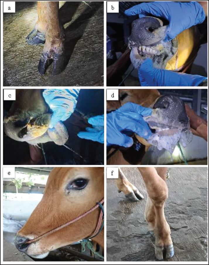 Fig. 1. Clinical symptoms during the infection phase include interdigital lesions, ulcers on the oral mucosa, and hypersalivation (a–d); Madura cattle in the recovery phase showed no symptoms of FMD (e,f). Blood sampling was performed twice, during the infection and recovery phases. Blood sampling during the infection phase was performed between days 3 and 7, when the animals showed clinical symptoms. The second sampling was performed during the recovery phase, between 28 and 30 days post-infection, when the animals were declared healthy. It showed no clinical symptoms of FMD through a series of physical and clinical examinations. Blood samples were collected in 3 mL volumes from the coccygeal vein using plain tubes (Becton Dickinson®, US). The blood samples were then centrifuged at 3500 rpm at room temperature for 10 minutes to obtain serum samples, which were stored in 1.5 mL microtubes (Safe-Lock 3810X; Eppendorf®) and stored in a freezer at (−20) °C. Serum biochemical preparation and analysisSerum sample analysis for CK, CK-MB, and LDH parameters was performed using a Semi-auto Blood Chemistry Analyzer ICHEM-I UBIO 535 with a spectrophotometry method, which measures absorbance by passing light with a specific wavelength through a glass object or cuvette with a wavelength of 340 nm (Brune et al., 2022). Measurements of MDA, SOD, GPx, haptoglobin (Hp), CrP, and cTnI activities were performed using the Sandwich ELISA method with the following catalog products: BT Laboratory, Shanghai, China, Cat. No. E0198Bo for MDA test; BT Laboratory, Shanghai, China, Cat. No. E0003Bo for SOD test; BT Laboratory, Shanghai, China, Cat. No. E0006Bo for GPx test; BT Laboratory, Shanghai, China, Cat. No. E2263Bo for haptoglobin test; LifeSpan BioSciences, USA, Cat. No. LS-F38924 for CrP test, and LifeSpan BioSciences, USA, Cat. No. LS-F14626 for cTnI. The microtiter plates provided in this kit were pre-coated with specific antibodies. Standards or samples were added to the appropriate microtiter plate wells, followed by specific biotin-conjugated antibodies. Next, avidin conjugated with horseradish peroxidase (HRP) is added to each well of the microplate and incubated. After the TMB substrate solution is added, only the wells containing antigen, biotin-conjugated antibody, and enzyme-conjugated avidin showed a color change. The enzyme-substrate reaction is stopped by adding sulfuric acid solution, and the color change is measured using spectrophotometry at a wavelength of 450 ± 10 nm. The concentration of the parameter in the sample is then determined by comparing the sample's optical density (OD) with the standard curve (Santosa, 2020). Statistical analysisThe variables observed in this study included antioxidant enzyme activity, cardiac markers, and APPs in Madura cattle infected with FMD. The data obtained from this study were analyzed statistically using software. The data results were analyzed using IBM SPSS Statistics for Windows, version 26.0. Statistical analysis uses a paired t-test with a significance level of 0.05 (p < 0.05). Meanwhile, Pearson correlation analysis is used to measure the relationship between blood chemistry parameters in the infection and recovery phases with a significance level of p < 0.05. The results of the analysis were presented in the form of means, SD, SE, correlation directions, and significance levels. Ethical approvalAll procedures involving animals in this study were approved by the Animal Ethics Committee of the Institute of Biosciences, Universitas Brawijaya, Indonesia, and were conducted in accordance with national and international guidelines on the treatment of laboratory animals (No. 039-KEP-UB-2023). ResultsIn the present study, APPs, cardiac biomarkers, and antioxidant enzyme activities were evaluated in Madura cattle naturally infected with FMD during the infection and recovery phase. Data analysis showed that the parameters CK and CK-MB in Madura cattle (Table 1) showed significant differences between the infection phase and the recovery phase (p < 0.05). At the same time, parameters such as CrP, Hp, GPx, cTnI, MDA, LDH, and SOD in the infection and recovery phases showed no differences (p > 0.05). The results of the correlation analysis between blood chemistry parameters showed a positive relationship (r=0.85; p < 0.05) between CK and CK-MB in the infection phase (Table 2). In contrast, in the recovery phase, there was a positive relationship (r=0.80; p < 0.05) between Hp and GPx (Table 3). Meanwhile, no relationship was found in other parameters. Table 1. Results of the analysis of acute phase protein values, cardiac enzyme activity, and antioxidant enzyme activity in Madura cattle naturally infected with FMD.