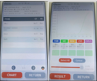 Fig. 5. In-clinic PCR showing negative results for Mycoplasma haemocanis and Hepatozoon canis, and positive for Rickettsia spp. at Day 105 Hematology and serum biochemistryElevated lymphocyte percentages were observed in all CBCs. Persistent thrombocytopenia and anemia were observed on days 3 and 11, respectively (Table 1). On day 11, leukocytosis was also observed (Table 1). On the other hand, increased alanine aminotransferase (ALT) (375 U/l), creatinine (192 umol/l), and triglyceride (1.74 0–1.13 mmol/l) and lowered serum phosphorus levels (0.42 mmol/l) were observed on day 1 (Table 2). At day 34, the ALT and creatinine values returned to normal. Table 1. Complete blood count results of a 3-year-old male Shih Tzu diagnosed with canine rickettsiosis in Cebu, Philippines.