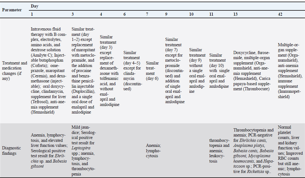 Table 3. Treatment timeline and key diagnostic findings of a PCR-confirmed canine rickettsiosis case in Cebu, Philippines.