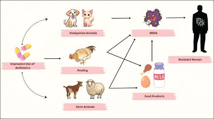 AbstractMethicillin-resistant Staphylococcus aureus (MRSA) is a significant public health concern because of its zoonotic potential and multidrug resistance. This review provides a comprehensive overview of the prevalence of MRSA in livestock and companion animals in Pakistan, emphasizing its molecular epidemiology and resistance mechanisms. MRSA has been detected in bovine mastitis, raw milk, meat, and companion animals, with alarming rates across species and regions. Risk factors include poor hygiene, inappropriate antibiotic use, and close human-animal interactions, all of which contribute to its spread at the animal-human-environment interface. Advanced diagnostic tools such as polymerase chain reaction and chromogenic media tests have facilitated rapid and accurate MRSA detection. The review also highlights alternative treatment strategies, including the use of medicinal plants, bacteriophage therapy, nanoparticles, and probiotics, as promising options to combat MRSA infections. Implementation of stringent hygiene measures, prudent antibiotic use, and further research into vaccines are critical for controlling MRSA in animals and safeguarding public health. Keywords: Methicillin-resistant Staphylococcus aureus, One Health, Antimicrobial resistance, Probiotic therapy, Public health. IntroductionStaphylococcus aureus (MRSA) is an opportunistic pathogen that inhabits the skin, mucosal membranes, and upper respiratory tracts of both animals and humans (Feng et al., 2008). In veterinary medicine, it is the leading causative agent of bovine mastitis in dairy cattle (Khairullah et al., 2022), resulting in huge economic losses worldwide (Li et al., 2018). Currently, most S. aureus strains classified as methicillin-resistant S. aureus (MRSA) exhibit resistance to penicillin derivatives (Grema et al., 2015). MRSA was first detected in the United Kingdom in 1961 (Khanal et al., 2022). The mecA gene, which encodes penicillin-binding protein 2a (PBP2a), is the gold standard for detecting MRSA (Javed, 2021). Since 1972, when MRSA was first isolated from bovine mastitis cases in dairy cattle in Belgium, multiple studies have verified the zoonotic transmission of MRSA from livestock to humans; after that, it was also recognized as livestock-associated MRSA (Khairullah et al., 2020). The World Health Organization (WHO) has classified methicillin-resistant MRSA as a "High Priority" pathogen on its Global Priority List of Antibiotic-Resistant Bacteria, underscoring the critical need for research and development of new therapeutics (Shrestha et al., 2021). MRSA has several virulence factors, including coa, spa, and Panton-Valentine leucocidin (pvl) genes (Sadiq et al., 2020). The pvl gene encodes the most potent staphylococcal leukotoxin, which can inhibit bovine neutrophils, destroy polymorphonuclear cells, and increase host resistance and pathogenicity (Shahid et al., 2023). The mecA gene in the chromosomal cassette of foreign DNA sections encodes the PBP2a protein, the primary mode of MRSA transmission (Ijaz et al., 2024). Enzymes such as proteases, lipases, elastases, and slime factors help host tissues grow and propagate to new sites (Gordon and Lowry, 2008). Until the mid-1940s, penicillin was referred to as the most effective antibiotic against many staphylococcal infections; not long after that, S. aureus strains started developing resistance to penicillin (Khan et al., 2014) and beta-lactamase enzyme production. The emergence of methicillin resistance, as depicted by the acquisition of the mecA gene, has led to a low affinity of bacteria for all β lactam drugs (Hamid et al., 2017). Furthermore, studies have detected MRSA in bovine mastitis (Imran et al., 2023), raw milk (Effendi and Harijani, 2017; Effendi et al., 2019), commercial raw meat, including chicken, beef, and mutton (Sadiq et al., 2020), and dairy farms (Tyasningsih et al., 2019; Khairullah et al., 2022; Imran et al., 2023). MRSA prevalence in animals is reported to be higher in many Asian countries compared to other continents, a trend often attributed to factors such as high-density livestock farming, variable antimicrobial stewardship practices, and the intensive use of antibiotics in animal production (Zaatout and Hezil, 2022), as well as their use in companion animals (Khairullah et al., 2023a). The polymerase chain reaction (PCR) is the "gold standard" for rapid and accurate screening tests for MRSA detection by identifying the mecA gene (Ijaz et al., 2023). The uncontrolled use of antibiotics in human and veterinary medicine is a significant contributor to the emergence and spread of MRSA infections, which limits therapeutic options (Khairullah et al., 2023b). The rise of AMR has increased the need for research into alternative antibiotics or treatment strategies (Jenkins et al., 2015). This review article aims to describe the molecular prevalence of MRSA in livestock and companion animals in Pakistan, developments in rapid diagnosis, and the exploration of various treatment options. Molecular prevalence of MRSA in animals in PakistanMRSA infection in large ruminants (cattle and buffaloes)There is still a paucity of information on studies in Pakistan that investigate the prevalence of MRSA in food-producing animals and their by-products. In fact, for some animals, data on MRSA investigation is nonexistent, especially with regard to pork meat from pigs, due to religious reasons, as it is considered a “taboo food” for Muslims. MRSA is considered as a contagious pathogen as it can cause subclinical and clinical mastitis in cattle and buffaloes. Interestingly, dairy farms have been reported to be important sources of MRSA spread, which have been linked to epidemics in both humans and animals (Tariq et al., 2023; Ijaz et al., 2023; Ijaz et al., 2024). A study was conducted in several Tehsils of Faisalabad District to determine the prevalence of MRSA in bovine milk. In this study, the prevalence of MRSA in cow and buffalo milk