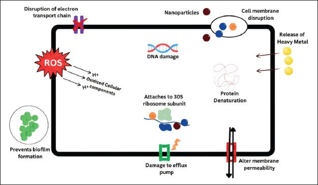 Nanoparticles for the treatment of MRSAThese are considered the wonders of modern medicine (Sungkaworn and Triampo, 2007). Its antibacterial activity is affected by its stability in infected cells and predictability of target site delivery (Azam et al., 2023). Nanoparticles are tiny, have a vast surface area, and can interact with specific receptors; their desirable qualities include biodegradability, biocompatibility, non-immunogenicity, and stability in physiological fluids. Nanoparticles can deliver high doses of antibiotics to the site of infection while reducing toxicity to nontarget cells (Andrade et al., 2022). Silver nitrate, zinc oxide, platinum, aluminum oxide, titanium dioxide, gold, magnesium oxide, iron oxide, and sodium alginate are the most commonly used metal oxide nanomaterials (Akhtar et al., 2019; Spirescu et al., 2021; kov et al., 2022; Mendes et al., 2022). Figure 4 depicts the multifaceted antibacterial mechanisms of nanoparticles.