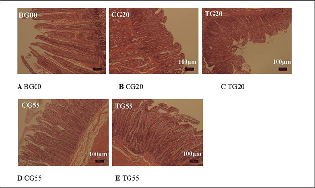 Fig. 2. Effect of probiotic formulations on duodenal morphology (10×). Representative photomicrographs (10× magnification) of duodenal sections from Hu sheep, stained with hematoxylin and eosin (H&E), illustrating villus height, crypt depth, and overall muscle thickness integrity. Images correspond to (A) BG00: Blank group at birth (0 days), before any treatment. (B) CG20: control group at 20 days of age, without probiotic treatment. (C) TG20: probiotic-treated group at 20 days of age. (D) CG55: Control group at 55 days of age. (E) TG55: Probiotic-treated group at 55 days of age. Morphological comparisons demonstrate the postnatal development of the duodenum and the structural influence of early probiotic intervention.