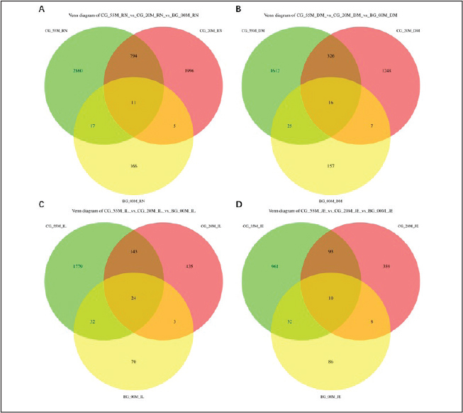 Fig. 3. Venn diagrams of the ASV composition in the gut microbiota of Hu lambs at 0, 20, and 55 days of age. Venn diagrams illustrate the overlap and uniqueness of ASVs in the microbiota from (A) rumen, (B) duodenum, (C) jejunum, and (D) ileum contents of Hu lambs at 0 (BG00), 20 (CG20), and 55 (CG55) days of age. Each circle represents an age group. The overlapping areas indicate the number of ASVs shared between groups, whereas the non-overlapping sections represent ASVs unique to a specific group. This visualization reveals the patterns of microbial community similarity and specificity across different gut sites as lambs aged.