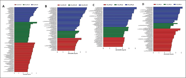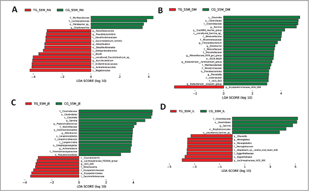 Fig. S7. Distribution of linear discriminant analysis (LDA) scores for Hu sheep at 55 days of age. The ordinate indicates the taxon with significant differences between groups; the abscissa corresponds to the logarithmic LDA scores based on taxonomic analysis. Differential microbial species in the GIT microbiota of Hu sheep between two groups. (A) Rumen. (B) Duodenum. (C) Jejunum. (D) Ileum.