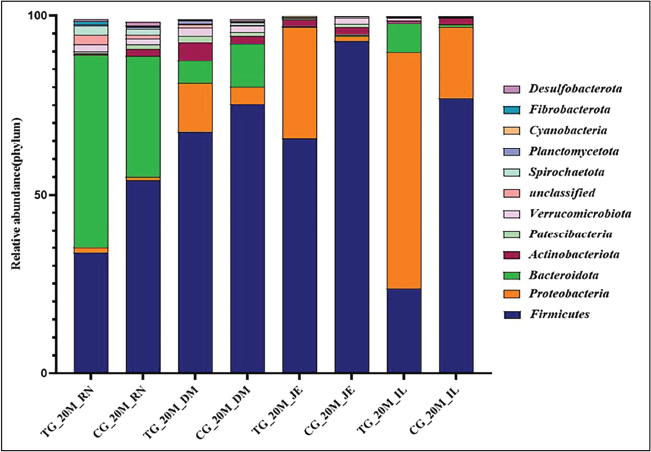 Fig. 4. Changes in the relative abundances of 20-day-old microbiota in the treatment and control groups at the phylum level. Stacked bar charts show the relative abundance profile of the bacterial communities at the phylum level in 20-day-old Hu lambs across different gut sites, comparing probiotic-treated groups (TG20) with their corresponding control groups (CG20). Only the dominant bacterial phyla with an average relative abundance of >1% are shown. The color legend identifies each phylum, allowing for a visual comparison of how the treatment influenced the overall microbial community structure in young lambs.